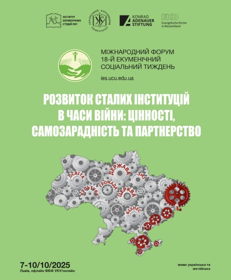 Традиційно у жовтні у Львові відбувається Міжнародний форум «Екуменічний соціальний тиждень». 7-10 жовтня Інститут екуменічних студій УКУ, спільно із Фондом Конрада Аденауера в Україні та Євангелічною церквою Німеччини, запрошують на 18-й Екуменічний соціальний тиждень «Розвиток сталих інституцій в часи війни: цінності, самозарадність та партнерство». Реєстрація триватиме до 5 жовтня 2025 року.